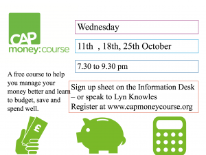 Our CAP Money course runs from 7:30 to 9:30 PM over three evenings: 11th, 18th and 25th October.